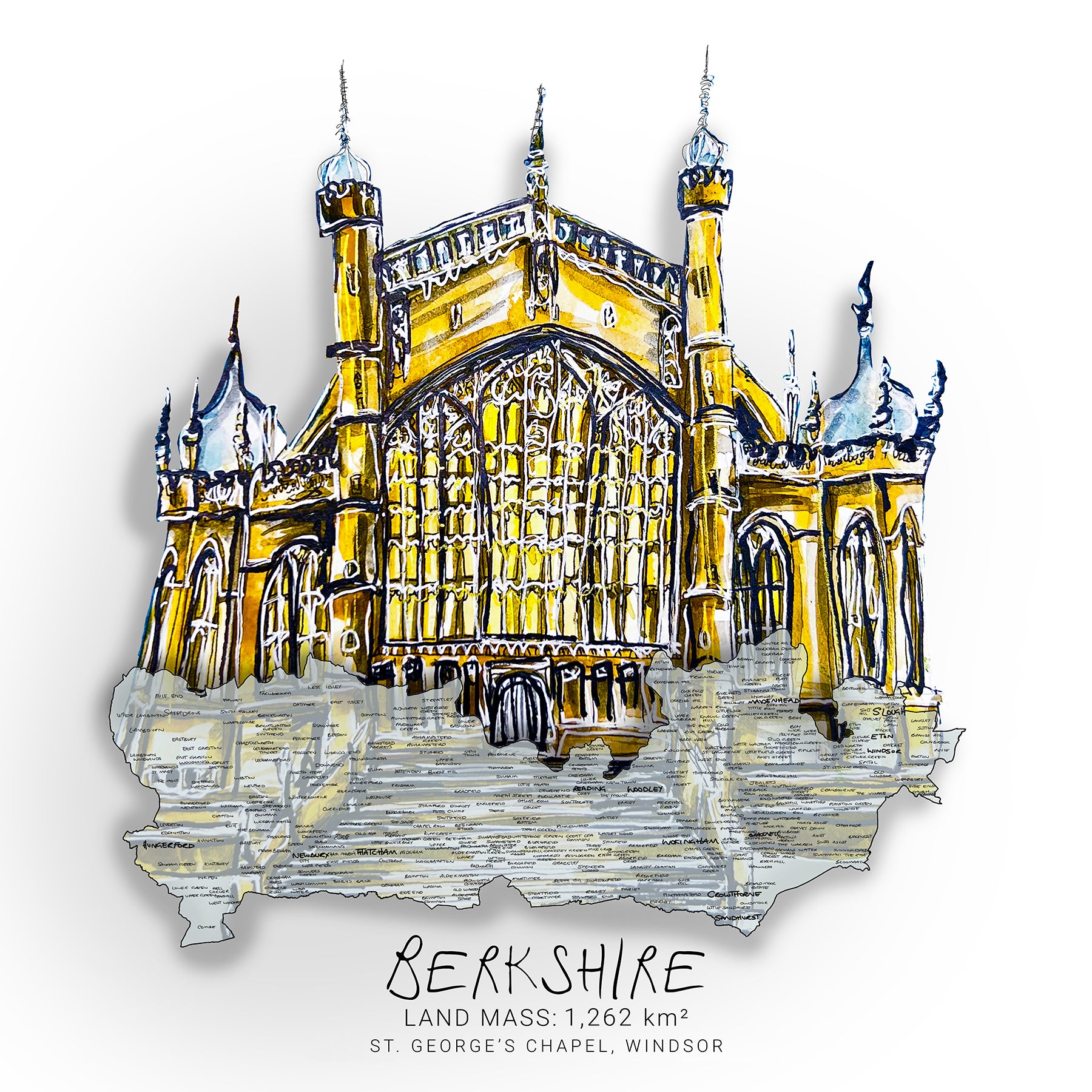 Get ready to explore the Berkshire countryside with the St George's Chapel map. This unique map features an original watercolour painting, showcasing every village, town, and city. A must-have for any map lover. Don't miss out on this one-of-a-kind treasure!
