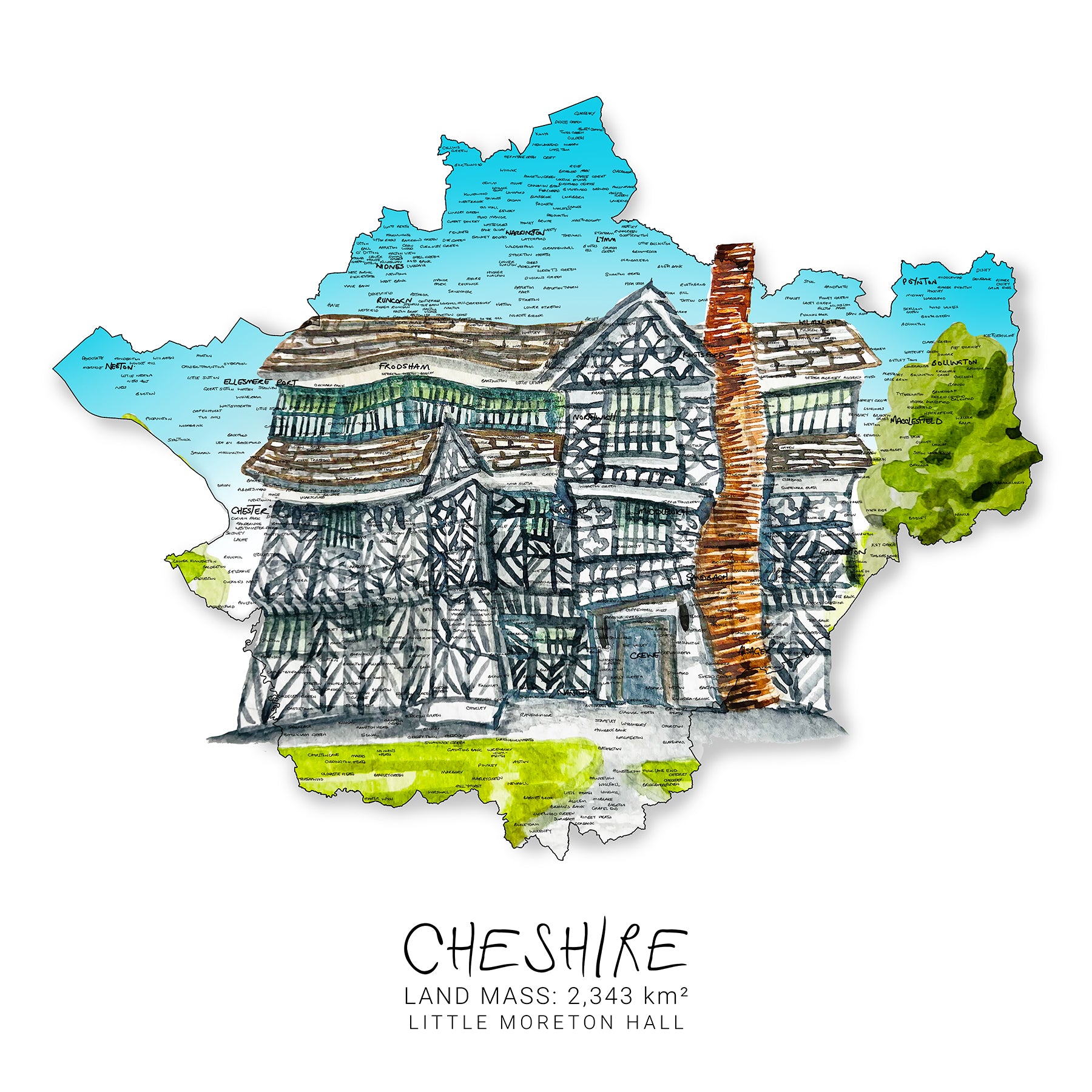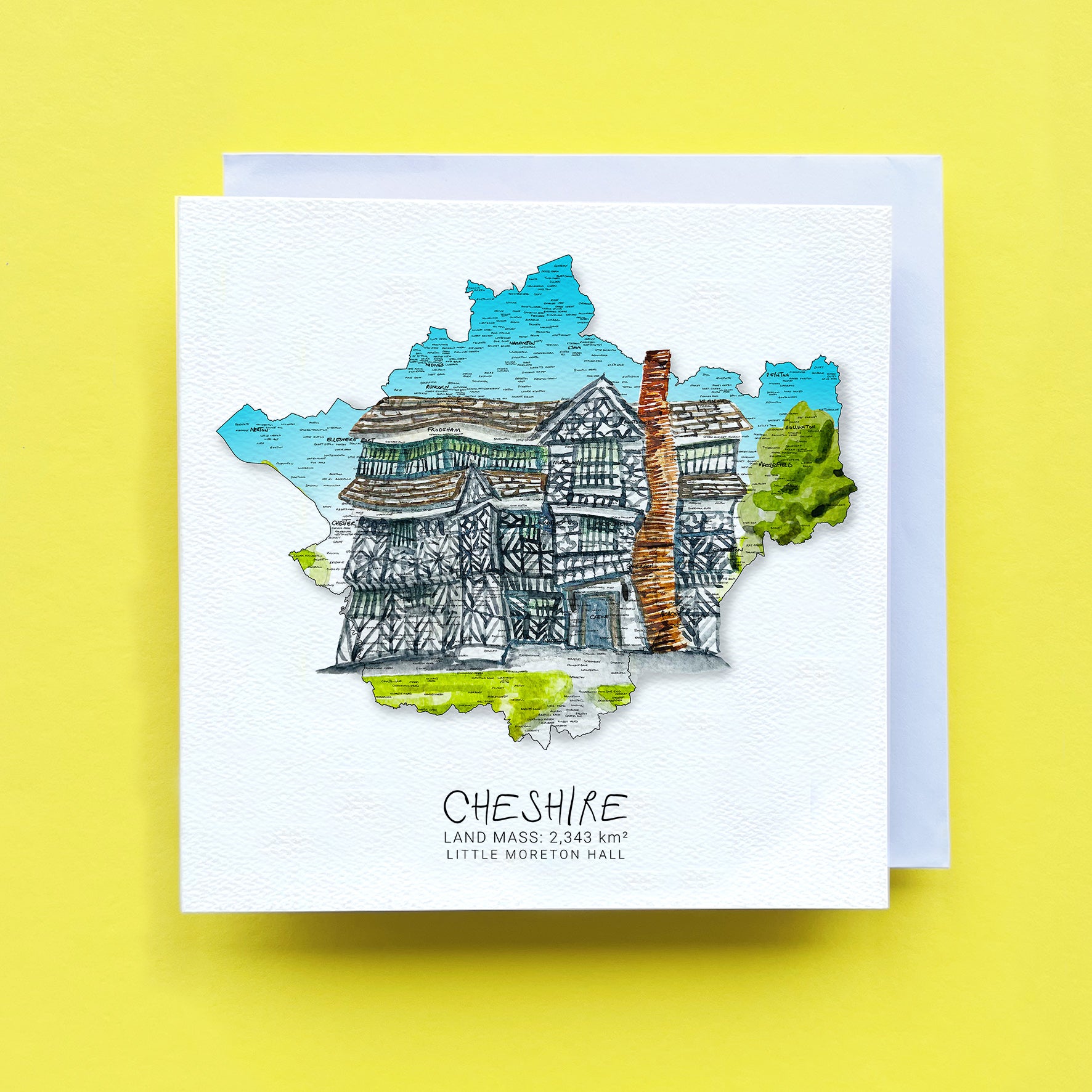 Get ready to explore the Cheshire countryside with the Little Moreton Hall map. This unique map features an original watercolour painting, showcasing every village, town, and city. A must-have for any map lover. Don't miss out on this one-of-a-kind treasure!